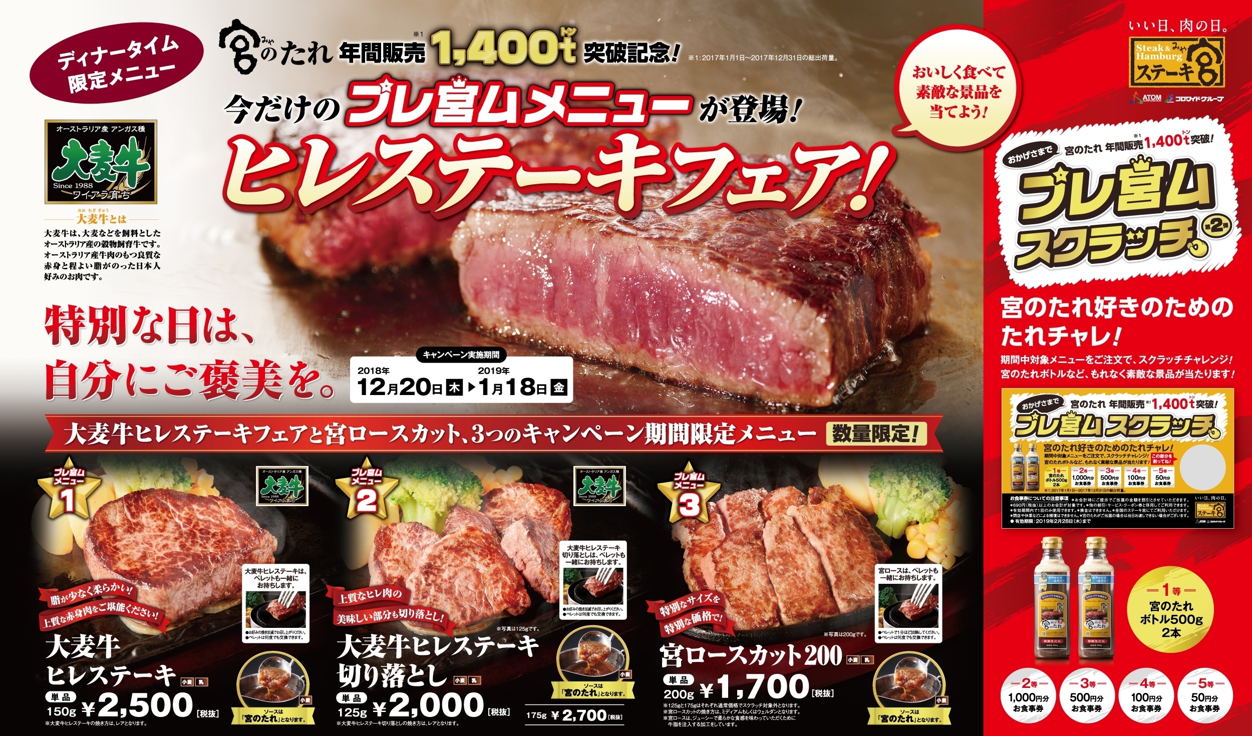 コロワイドグループの株式会社アトム(本社:愛知県名古屋市、代表取締役社長:石川恵輔)は、2018年12月20日(木)よりステーキ宮をもっともっと楽しめる特別企画「プレ宮ム」企画の第二弾を開始いたします。