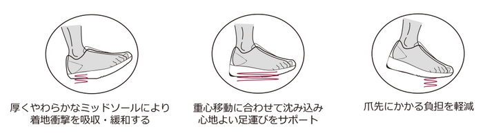 歩行時のミッドソールの形状の変化が、浜辺のような足裏感覚を再現し、足指と足底の運動機能を活性化させます。