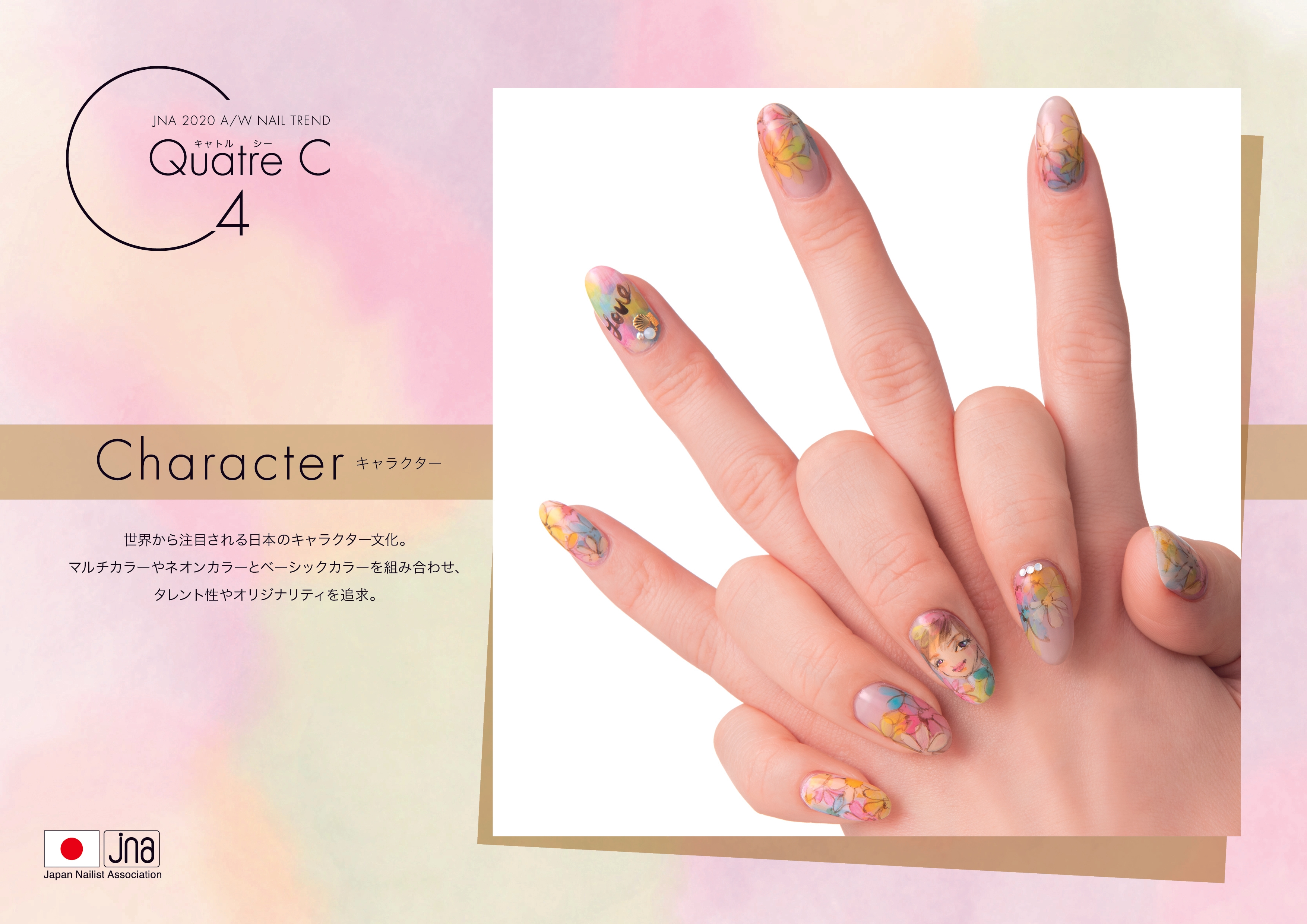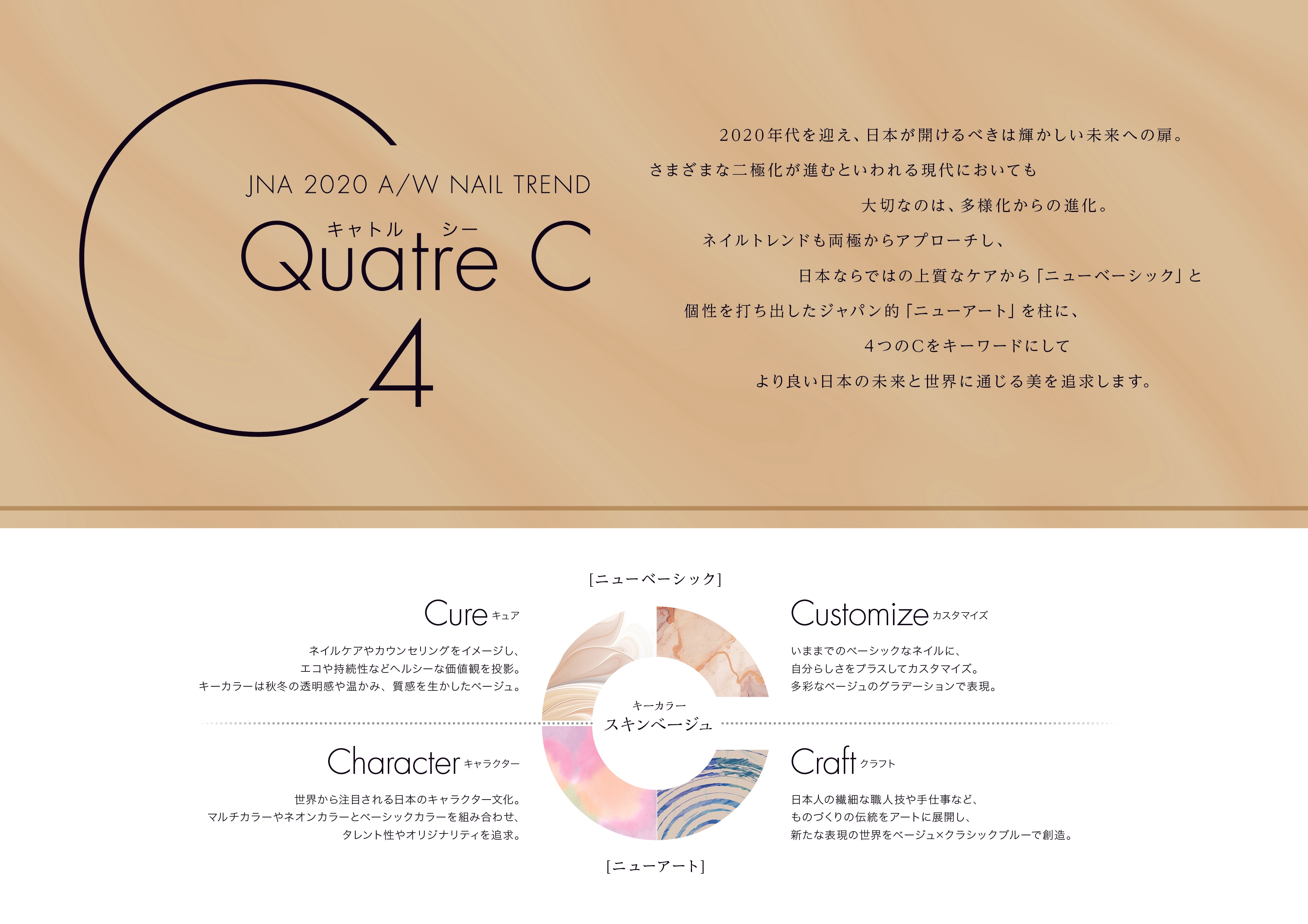 NPO法人日本ネイリスト協会(略称:JNA、所在地:東京都千代田区、理事長:仲宗根 幸子)は、2020年秋冬のネイルトレンドのテーマを「Quatre C(キャトルシー)」とし、このテーマを表現する作品を発表します。