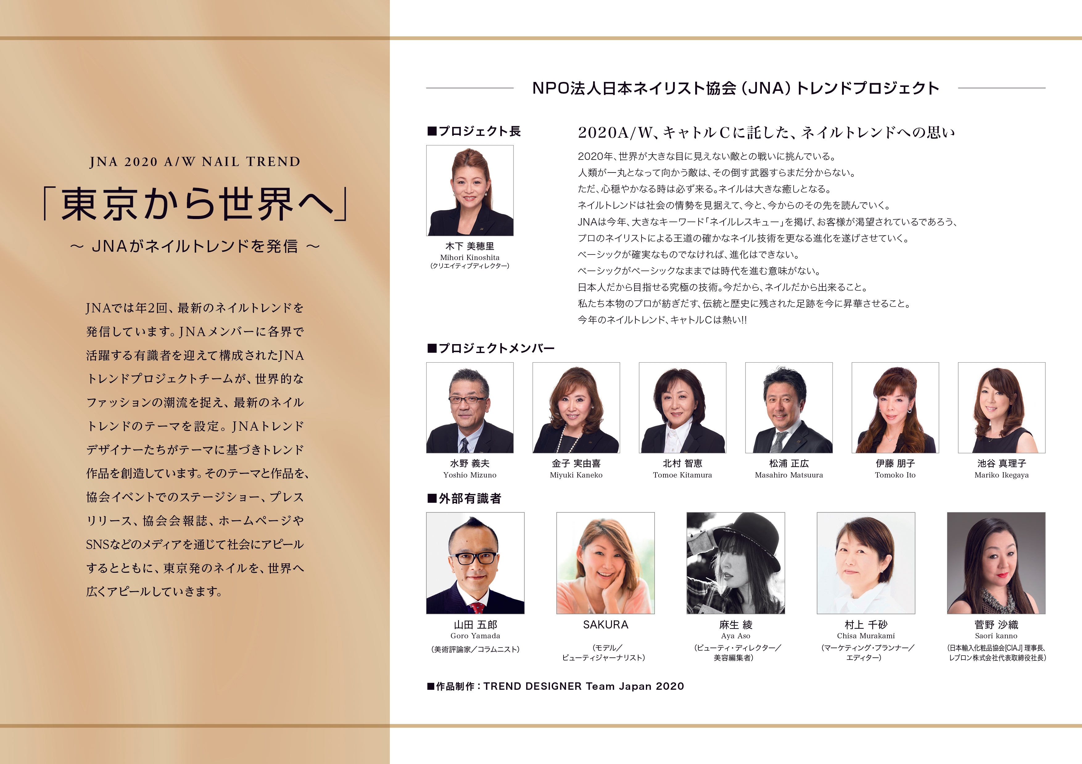 このネイルトレンドは、世界的なファッションの潮流なども踏まえた上で、「JNA ネイルトレンドプロジェクト(プロジェクト長 木下 美穂里)」が年2回設定し、発表しています。JNAメンバーに各界で活躍する有識者(麻生 綾、菅野 沙織、SAKURA、村上 千砂、山田 五郎 ※敬称略)を迎え、熟考し作り上げたトレンドを元に、JNAトレンドデザイナー(認定講師3,150名の中から選出されたトレンドデザイナー)が制作を担当しています。