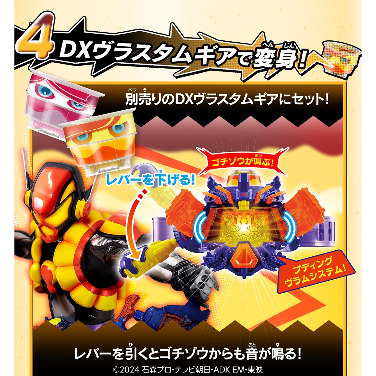 さらに本商品は別売りの「DX変身ベルト ヴラスタムギア」とも連動が可能。通常DX版のライダーゴチゾウ同様に変身遊びが可能なほか、ヴラスタムギアから流れる音声に加えてゴチゾウからも効果音を発動させることが可能です。さらに、通常DX版のライダーゴチゾウと同様に別売りの「DX変身ベルトガヴ」でも変身遊びが可能です。