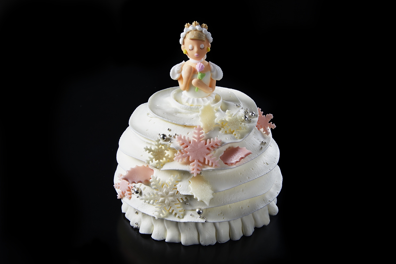 ピンク色の雪の結晶やリーフの飾りでドレスを表現した聖夜に降り立つプリンセスのケーキは、苺と生クリームの2段サンドの贅沢な味わいのクリスマスケーキです。