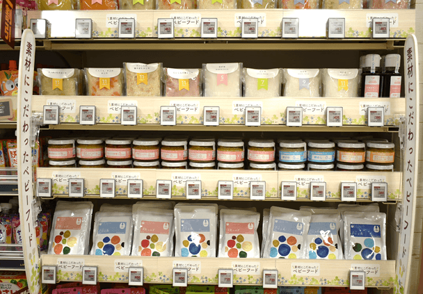 子育て世帯向けにベビー用品コーナーを設置し、定番商品から「はたけのみかた」「味千汐路」などの素材にこだわった商品、冷凍ベビーフードまで幅広く展開いたします。