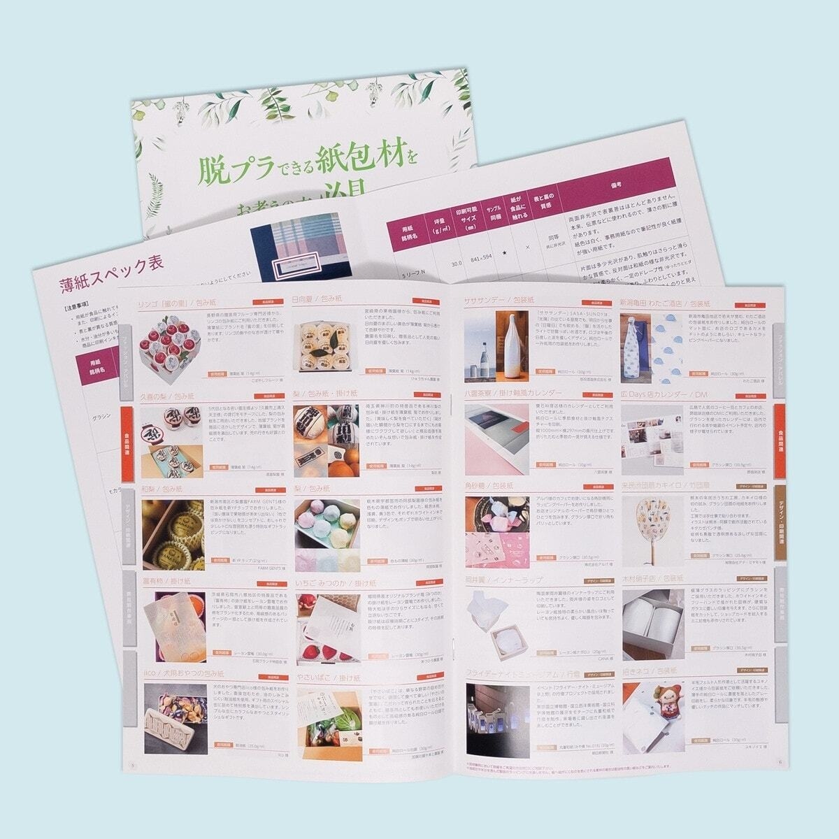 薄紙印刷で対応している紙のスペック表や採用事例集、グラスパックの資料をセットにしています。