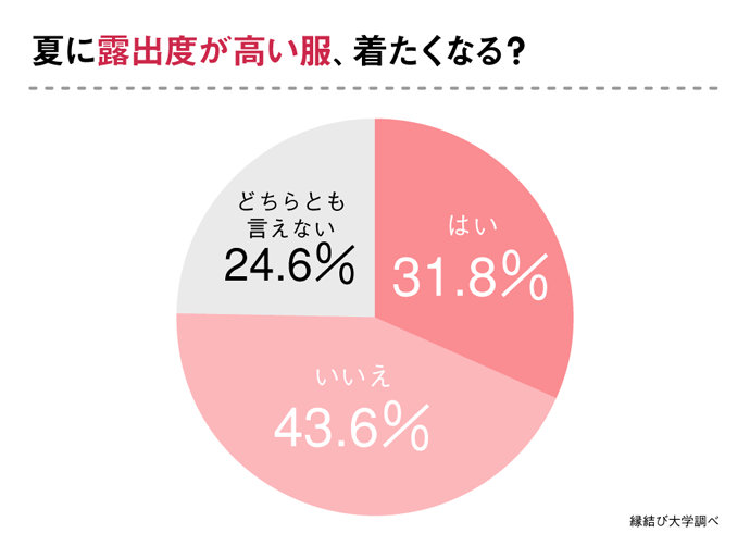 反対に露出度が高い服を避けたい人は、43.6%です。人に見せられるほどスタイルがよければ露出度が高い服を着てみたいけれど、「体型に自信がないと露出するのは控えたい」という乙女心なのかも知れません。