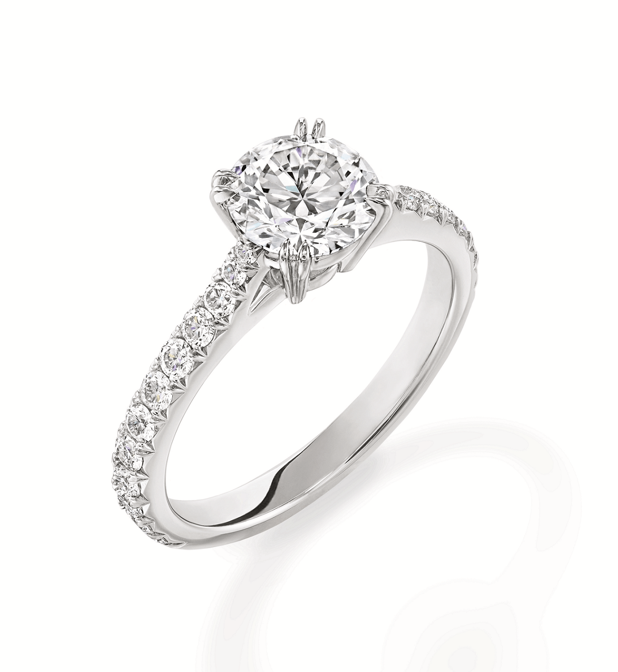 アームには24個のラウンド・ダイヤモンドが、プラチナの存在を感じさせない繊細なカットダウン・セッティングにより配され、美しい輝きのラインを描きます。ひとつひとつのダイヤモンドに理想的なカットが施されたこのエンゲージメント・リングは光を最大限に反射し、まるでふたりのきらめく愛のように最高の輝きを放ちます。