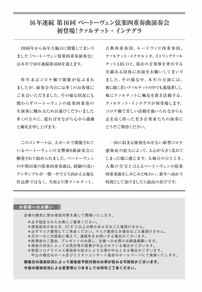 公演名 :16年連続 第16回 ベートーヴェン弦楽四重奏曲 [9曲] 演奏会