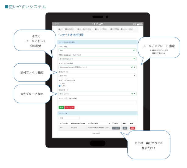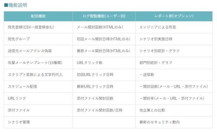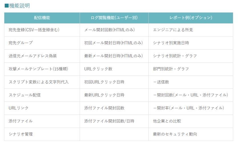 標的型攻撃メールに偽装したメールテンプレート文、宛先グループへのメール配信、メール・URL・添付ファイルの開封数の一覧表示などを有したクラウドサービスを1ヶ月単位の月額固定費用でご提供いたします。