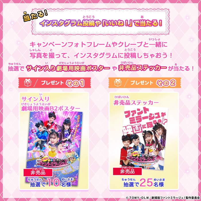 期間中、ディッパーダンへご来店、ご購入の商品を撮影いただき、公式フォロー、キャンペーン指定のハッシュタグを付けて投稿してくださった方の中から、抽選で『劇場版ファントミラージュ』サイン入り映画ポスター、非売品ステッカーをプレゼントいたします!