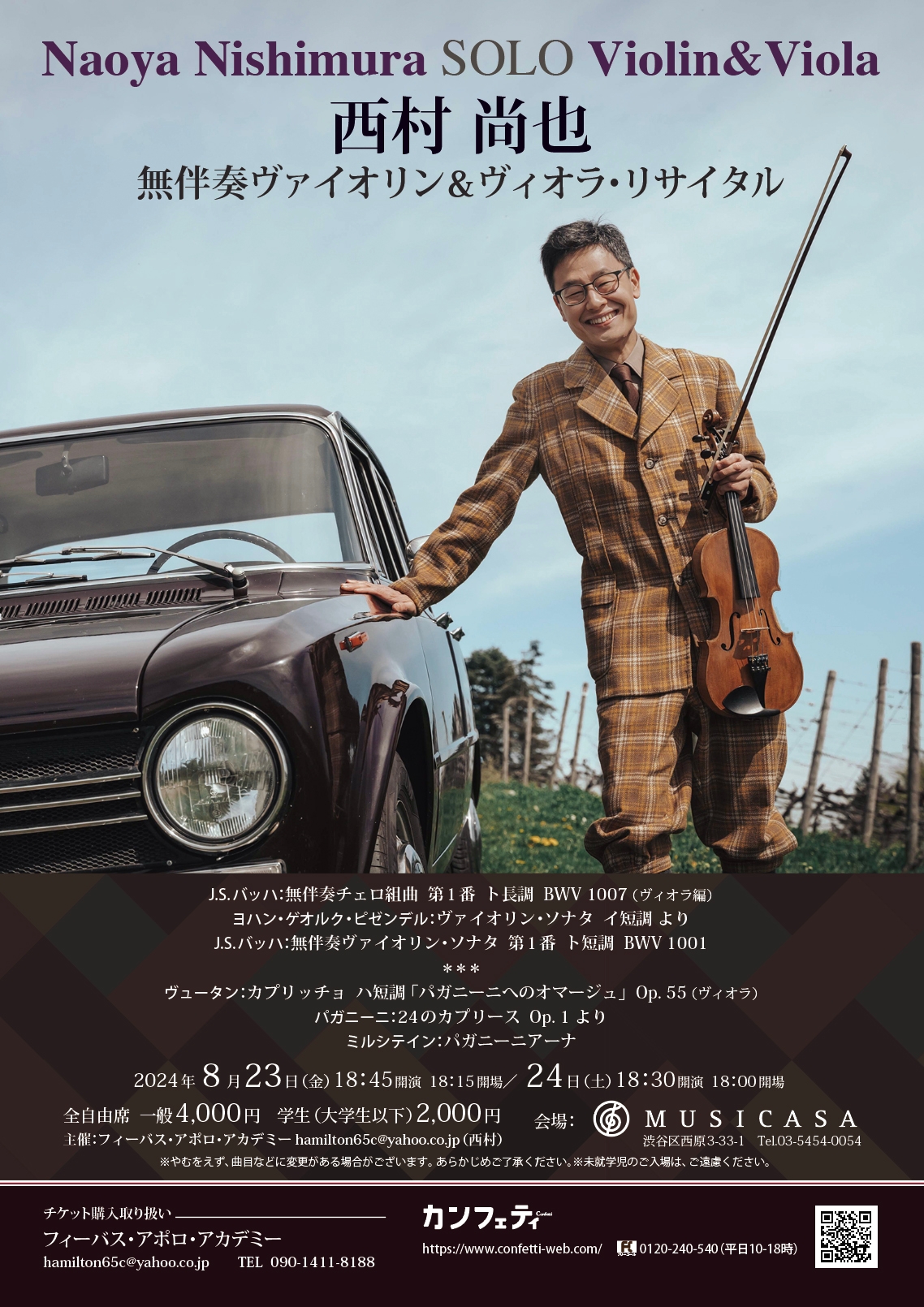 フィーバス・アポロ・アカデミー主催、『西村尚也 無伴奏ヴァイオリン&ヴィオラ・リサイタル』が2024年8月23日 (金) 〜 2024年8月24日 (土)にムジカーザ(東京都 渋谷区 西原 3-33-1)にて上演されます。