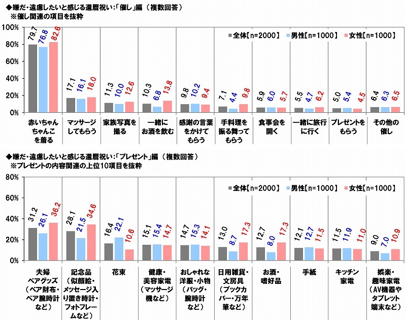 全回答者(2,000名)に、嫌だ・遠慮したいと感じる還暦祝いの催しについて聞いたところ、「赤いちゃんちゃんこを着る」が79.7%で最も高く、次いで「マッサージしてもらう」が17.1%で続きました。還暦を迎える実感がわかない還暦人は、赤いちゃんちゃんこを着るのを気恥ずかしく感じてしまうことが多いようです。せっかくの還暦祝いを喜んでもらうためにも、本人の希望をよく確認して催しを企画すると良いのではないでしょうか。