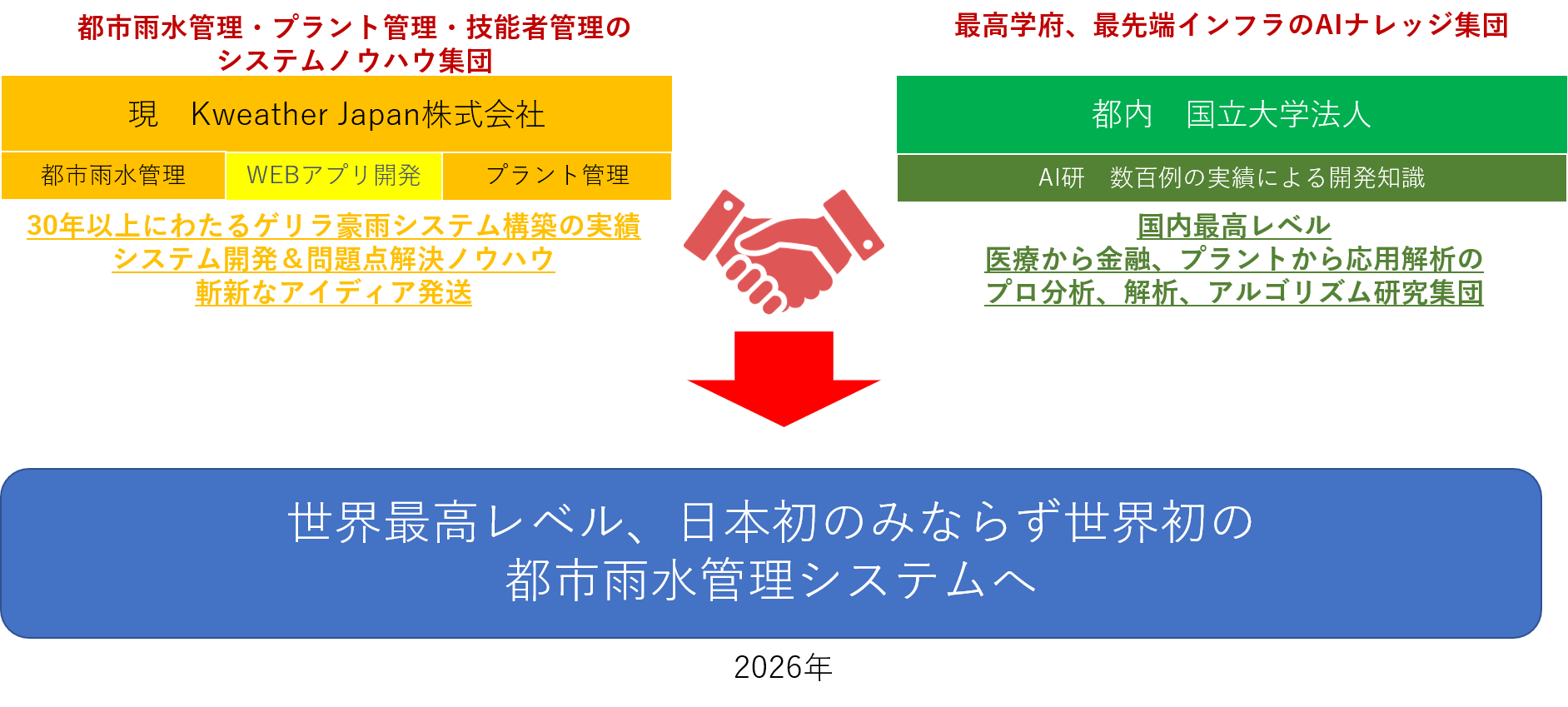 Kweather Japan株式会社(東京都府中市、代表取締役社長:上西 範久)は、都内国立大学法人とAI利用をした都市雨水排水支援システムの共同研究を行い、都市を襲うゲリラ豪雨に対し雨水ポンプの最適化運転判断支援を可能としたシステム「Rain AI」を発表します。