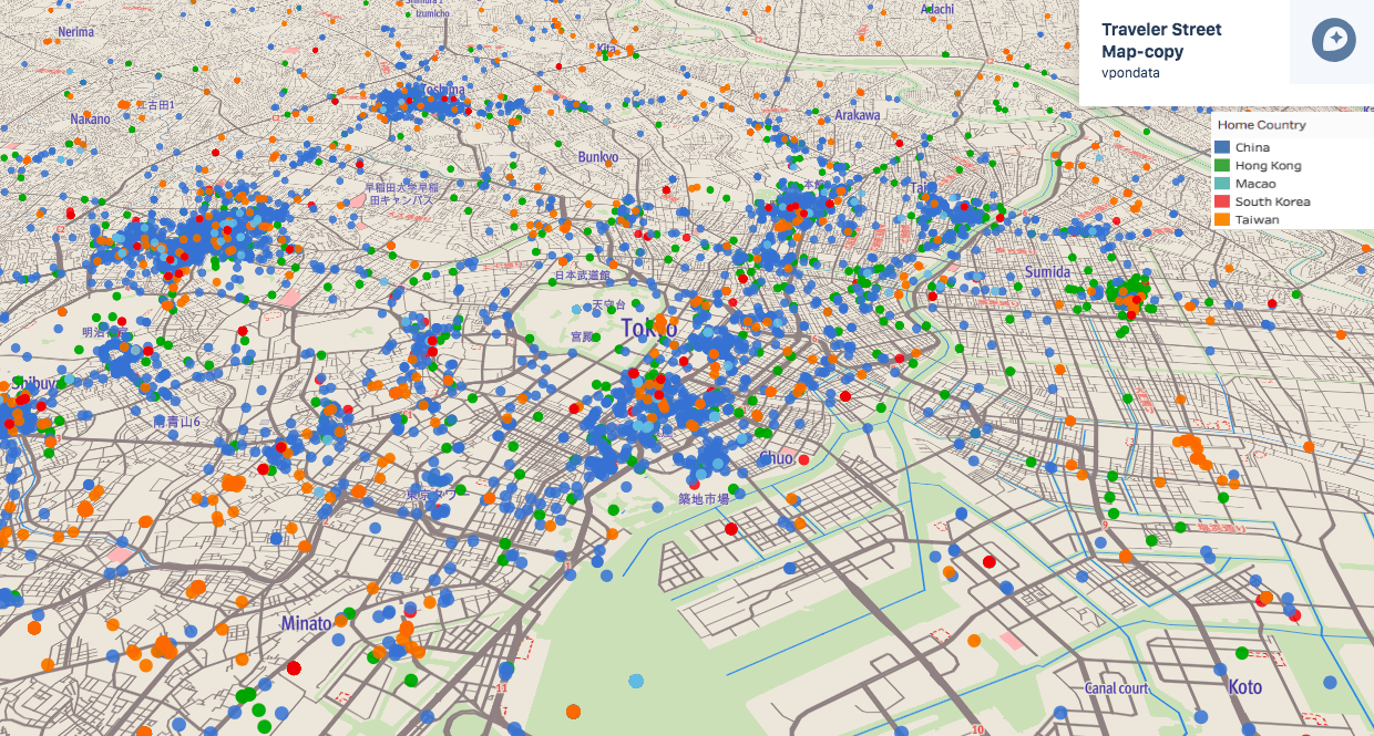台湾、香港、上海、シンガポール、東京、大阪に拠点を持つVponではこの日本政府観光局(JNTO)などの官公庁の活動に対して、Vponの訪日旅行客に関連したセグメントデータを提供し、日本政府観光局(JNTO)のケースではオンラインユーザーデータの分析を含め、データの視覚化ツール(ダッシュボード)を提供することでより効果的なプロモーション展開を支援します。