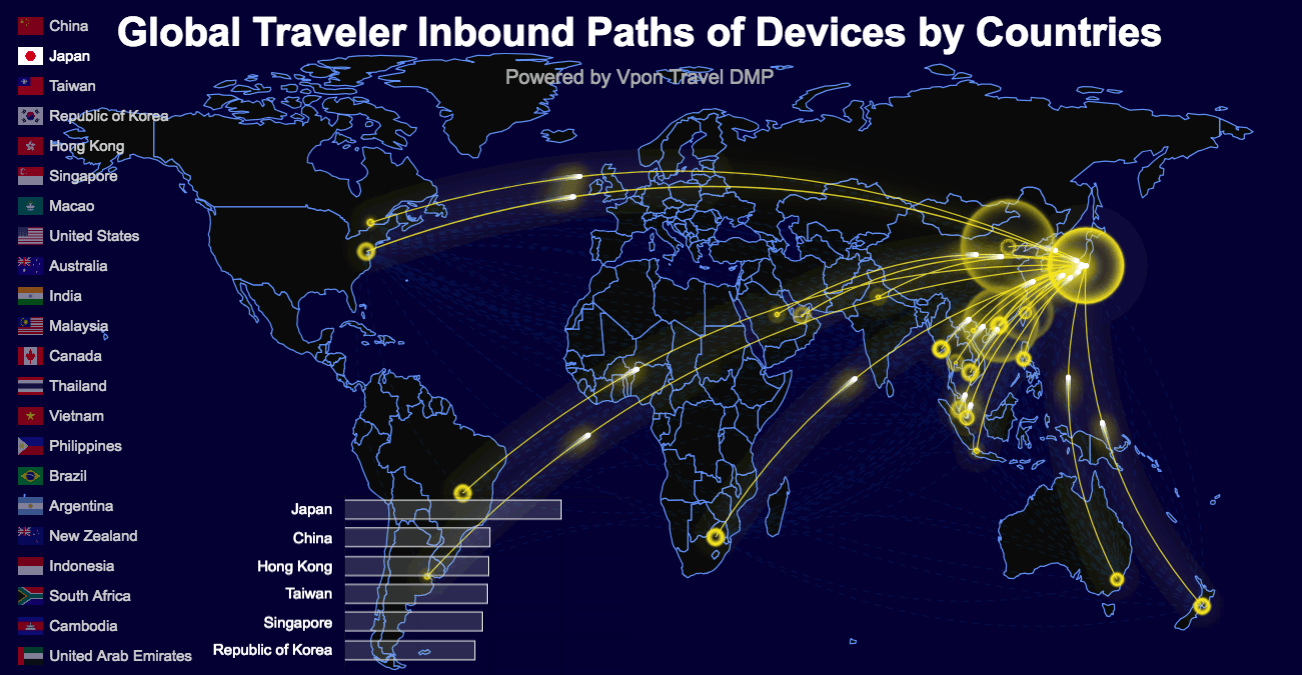 インバウンド(訪日旅行者)事業を展開するVpon JAPAN株式会社(本社:東京都新宿区、代表取締役社長:篠原 好孝。以下、Vpon)は、Vponの保有する台湾・香港・中国を中心とするアジア全域6000万人の海外旅行者データの提供、および日本政府観光局(Japan National Tourism Organization、略称JNTO)のような官公庁に対して自身の保有するユーザー分析を含むインバウンドに特化したビッグデータソリューションならびにBIツールの提供を開始しました。