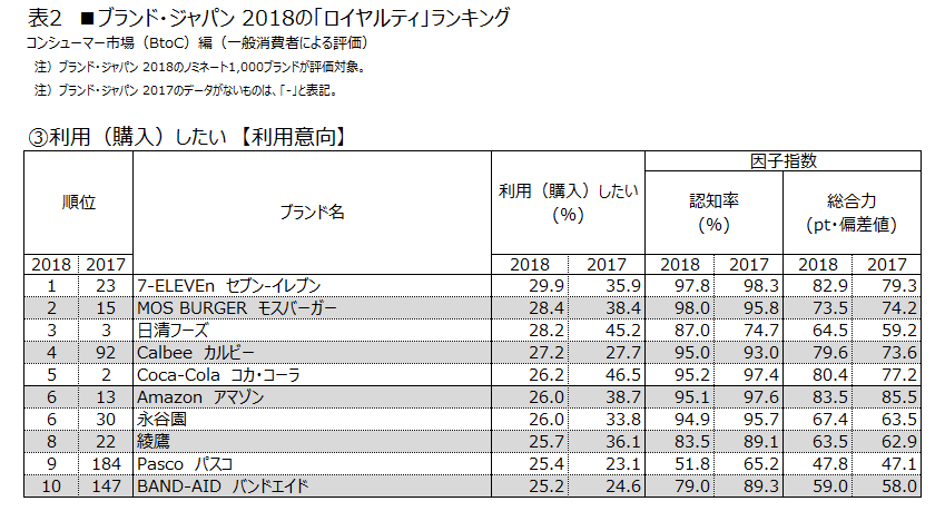 ※表2『ブランド・ジャパン 2018の「ロイヤルティ」ランキング』より