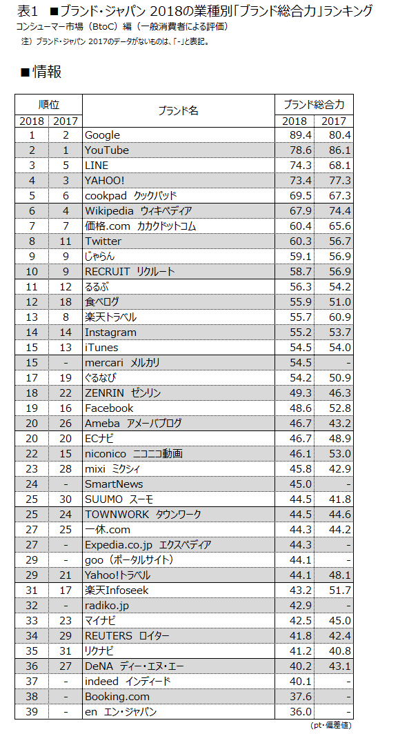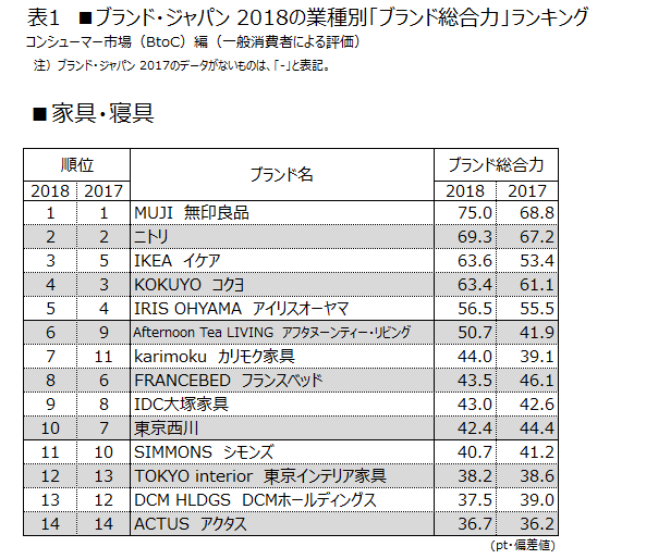 ※表1『ブランド・ジャパン 2018の業種別「ブランド総合力」ランキング』より