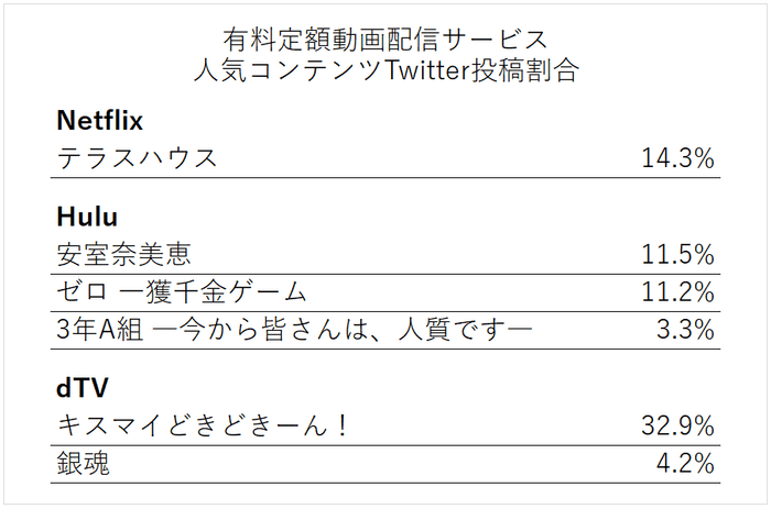 また、映画「銀魂2 掟は破るためにこそある」のタイアップとしてdTV独占配信されたオリジナルドラマ「銀魂2 -世にも奇妙な銀魂ちゃん-」(4.2%)についてもTwitter投稿数が多くありました。