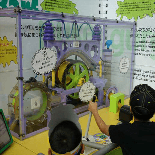 映画村では「うんち流忍者・雲竹斎(うんちくさい)」というキャラクターと一緒に楽しみながら人間の体のふしぎを体験してもらいます。高さ4mの大きな口から入り、高さ1.5mのうんちのゴールまで、まるで巨人に飲み込まれたように体の中を大冒険しましょう。
