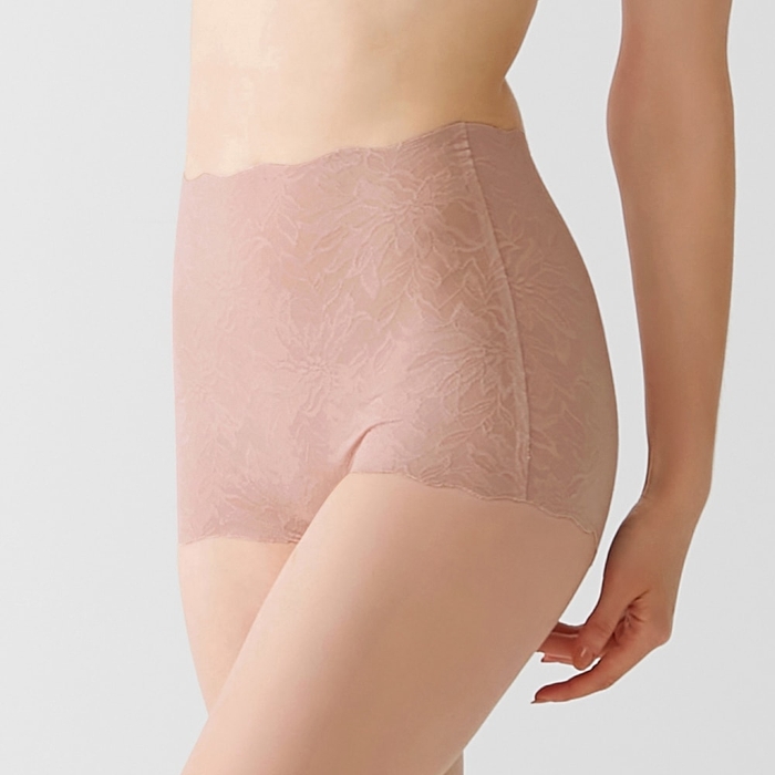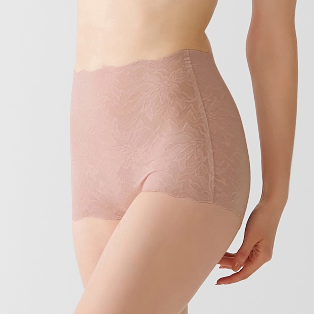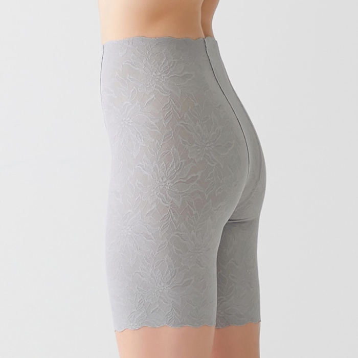 「ガードルファンデ」は、生地端が切りっぱなしのカットオフストレッチレースを使用した完全無縫製のソフトガードルです。やわらかな肌あたりでレース特有の凹凸感を感じにくく、縫い目や洗濯タグもなくして肌への刺激を軽減。ストレッチレースのほどよいパワーで、おなかとヒップまわりをやさしく補整します。ウエストや足ぐりにゴムを使っていないので、締め付けが苦手な方やガードル初心者の方にもおすすめです。本商品は、幾何柄のベースに大柄のお花を配置したレースを採用。エネルギッシュかつ繊細な印象に仕上げています。また、ボタニカル成分配合のローズヒップ加工で肌へのやさしさにもこだわりました。気分やアウターに合わせて選べるロングソフトガードルとショートソフトガードルをラインアップ。同じくカットオフレースを使用した完全無縫製の「ブラファンデ」と上下セットで着用いただけます。マチ付きで1枚で履くこともでき、薄着になるこれからの季節にパンティラインに悩む方にもぴったりのアイテムです。お腹、ヒップラインをすっきり補整する低刺激の「ガードルファンデ」で春のファッションをお楽しみください。