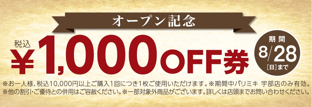 税込10,000円以上お買い上げで、1,000円(税込)を割引いたします! 下記の画像を印刷してお持ちいただくか、画面のスクリーンショットをスタッフにご提示ください。※パリミキ 宇部店のみ有効。