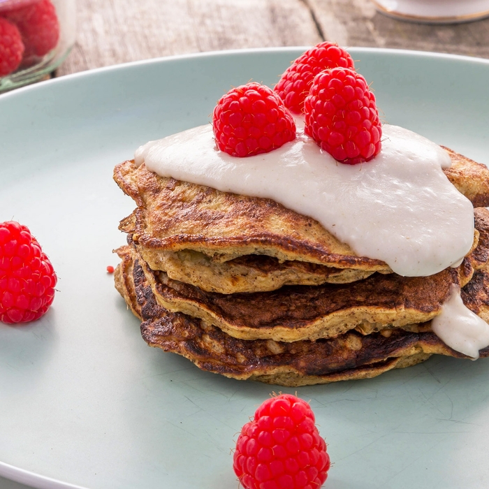 2.フライパンを中火にし、ココナッツオイルを加えます。パンケーキをフライパンに落とし、表面に気泡が現れるまで1-2分調理します。