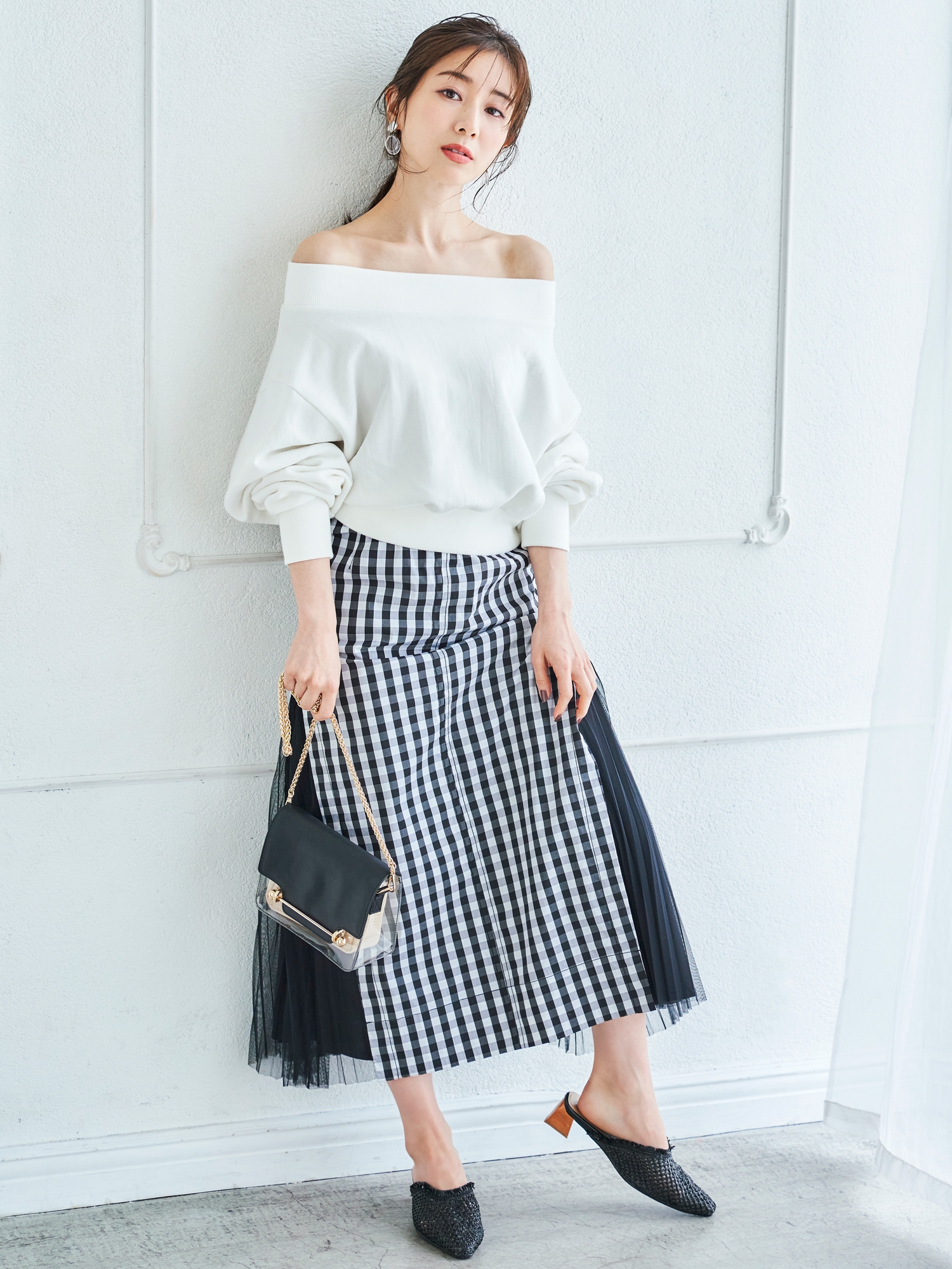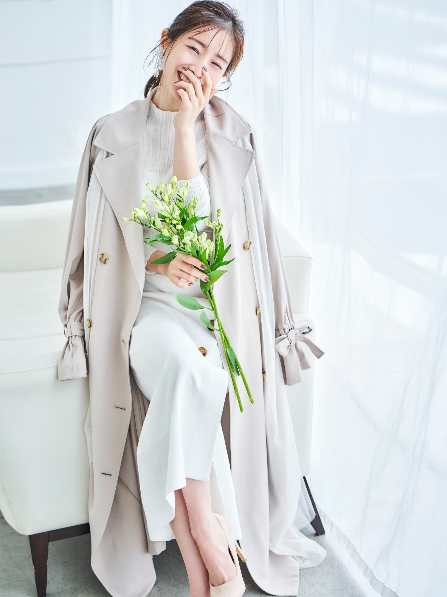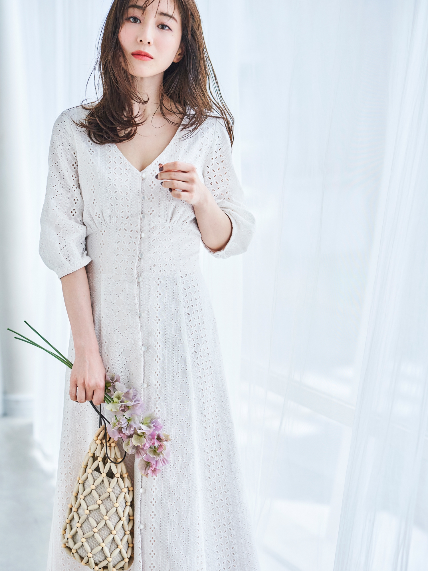 「SHEER ~透かす、光。透ける、肌~」と題した今回のWEBマガジンでは、春らしい上品なシアーニットやトレンドの透かし編みクロシェニットワンピース等を着用し、田中みな実さんの柔らかく女性らしいムードを引き出しています。