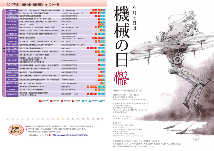一般社団法人日本機械学会(会長:大島まり 東京大学)は、「機械」の意義や役割を広く社会とともに考え、人間と機械のふさわしい関係を模索するため、日本機械学会が中心となり産官学の関係各方面と協力して、七夕の中暦(月遅れ)にあたる8月7日を「機械の日」、8月1日~7日を「機械週間」(メカウィーク)と2006年に制定しました。