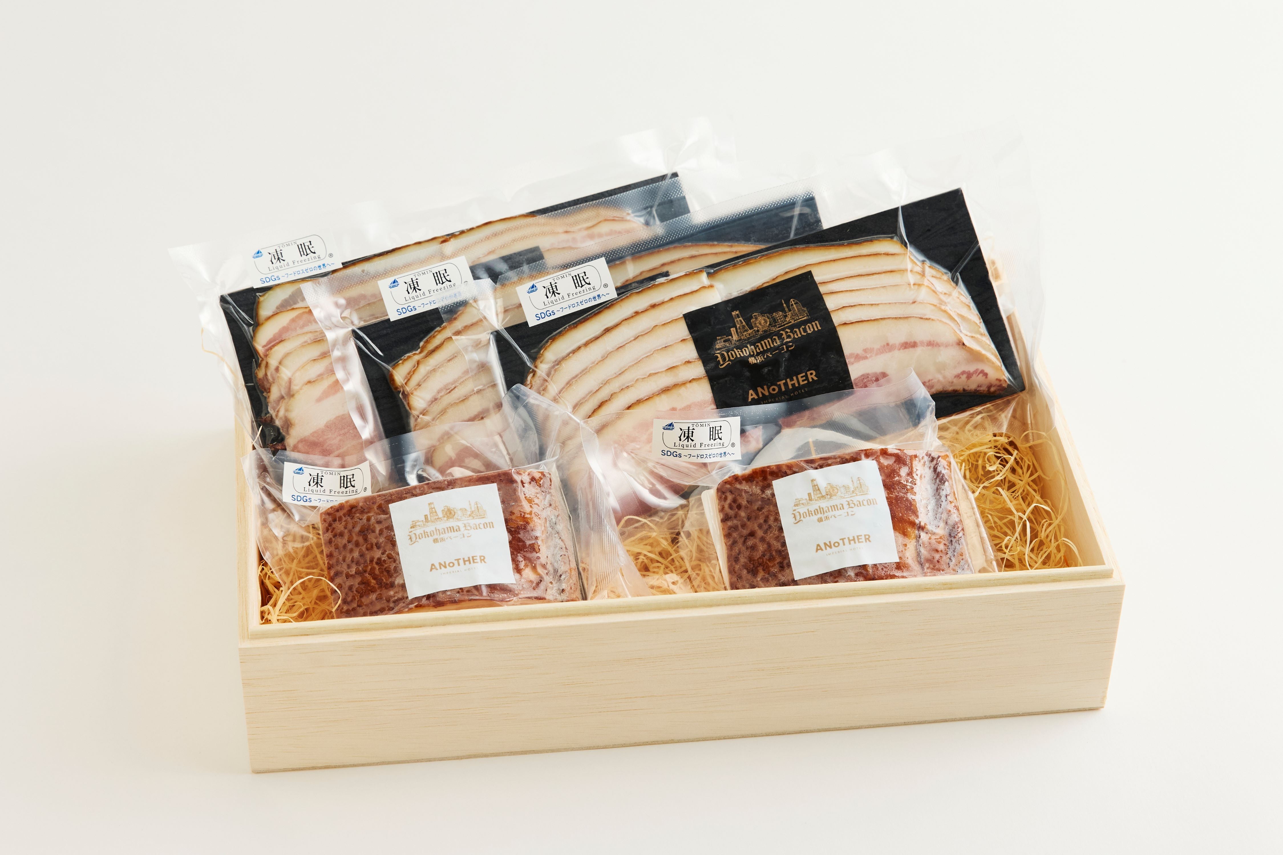 また、株式会社テクニカンが販売する「横浜ベーコン」も併せて展開。テクニカン代表取締役社長 山田の家業が食肉業を営んでおり、自身の家族や大切な方にのみお作りしていた秘伝のベーコンを商品化したものです。長期間の塩もみ、燻製によって上質な肉質に仕上がった手作りベーコン。更なる美味しさを追及し、パッケージも帝国ホテル向けに美しく仕上げており、贈り物にもピッタリです。