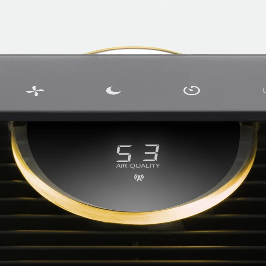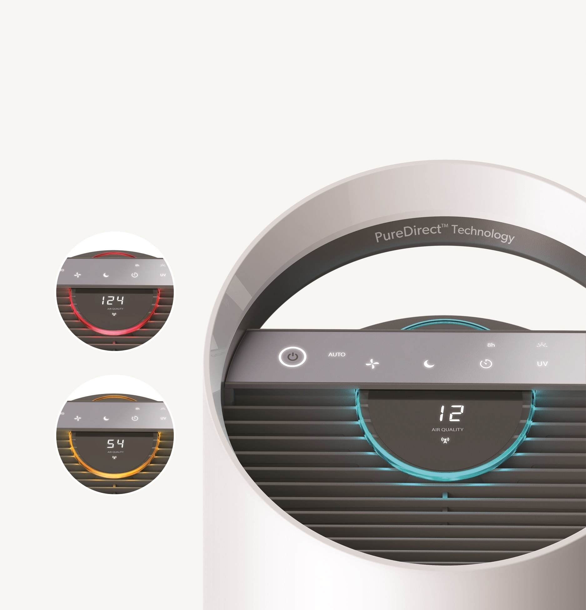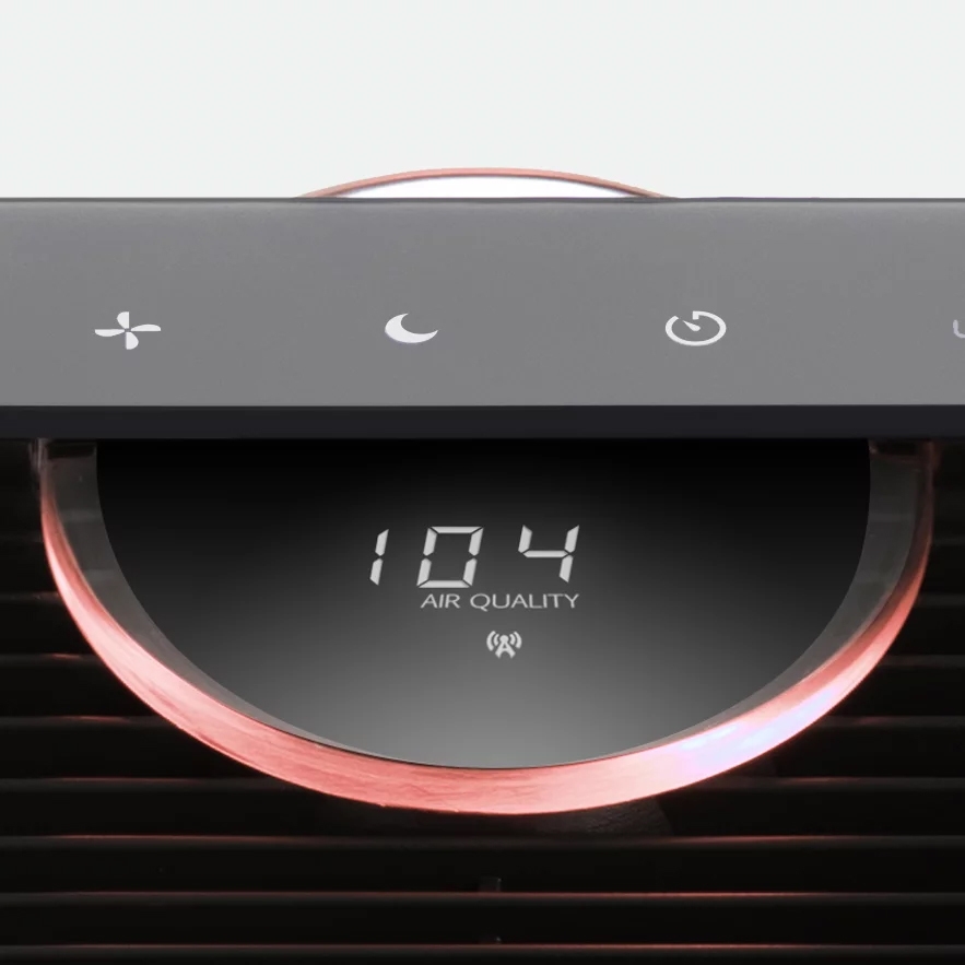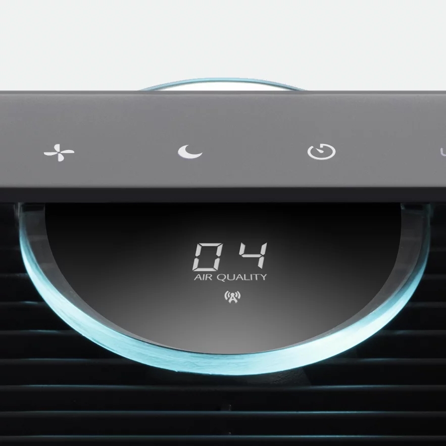 空気の質は「きれい」「やや汚れている」「非常に汚れている」の3色で視覚的に伝え、パネルにも数値で表示されます。オートモードでは、センサーポッドからの空気測定値に基づいて自動的にファンスピードを調整します。