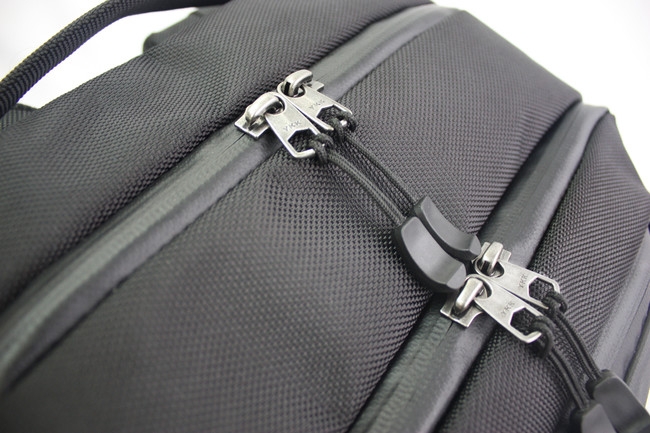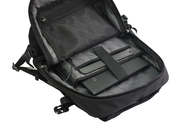 小物用のポケット、中央にはファスナーポケット、小物ポケット、ペン差し、メインルームにはメッシュポケット、クッション付きの2弾ポケットがついています。右側側面にはお持ちのバッテリーなど収納できるポケットが付属、本体外側の側面から続いているUSBコネクターと接続し充電出来ます。