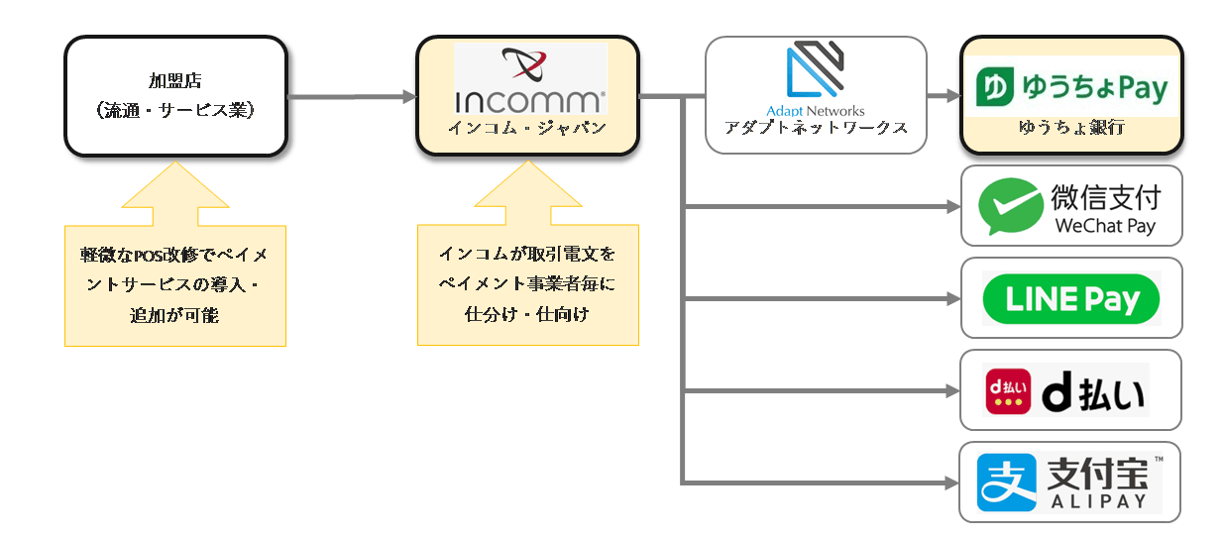 インコム・ジャパンは、既に「WeChat Pay」「LINE Pay」「d払い」「Alipay」のQR/バーコード決済を国内の業界大手ドラッグストア・家電量販店など1万店舗超で提供しております。これまでの各種QR/バーコード決済のアクワイアラとしての実績が評価され、この度ゆうちょ銀行が提供を予定しているスマホ決済サービス「ゆうちょPay」とシステム連携し、インコム・ジャパンのサービスを利用している加盟店が簡易に「ゆうちょPay」を導入できるインフラを提供すべく提携を行うこととなりました。