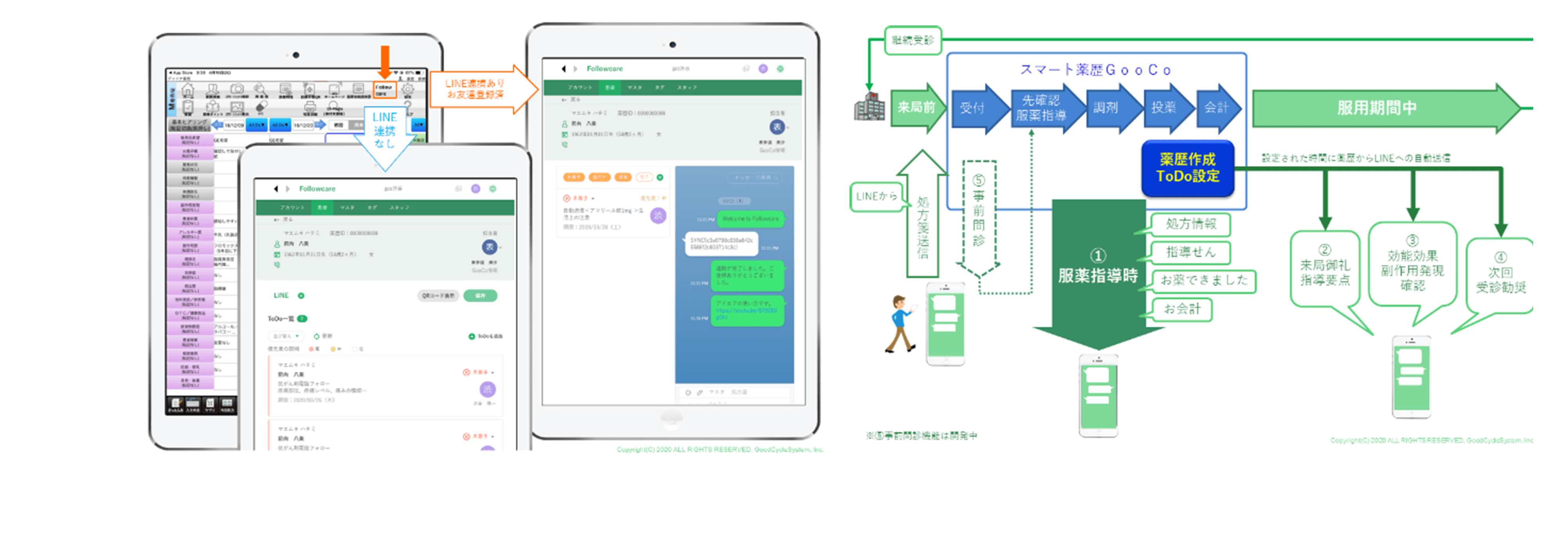 株式会社グッドサイクルシステム(本社:東京都渋谷区、代表取締役:遠藤 朝朗)は、電子薬歴システムとLINEを連携させた服薬期間中フォロー機能およびスマホ決済機能等を備えた「Followcare(フォロケア)」をリリースします。スマホ決済機能を活用することで、薬局は、患者さんの来局なしに事前にオンライン服薬指導に伴う代金収納を行うことが可能となります。