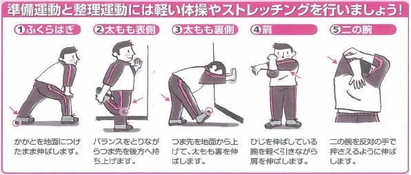準備運動として、ウォーキングの前に軽い体操やストレッチをしてから始めましょう。