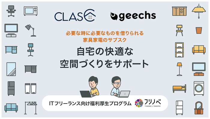 ギークス株式会社(本社:東京都渋谷区、代表取締役社長:曽根原 稔人、以下ギークス)は、ITフリーランスに向けて、家具・インテリア・家電のサブスクリプションサービス「CLAS」を優待価格で提供開始したことをお知らせします。本サービスは、株式会社クラス(本社:東京都目黒区、代表取締役社長:久保 裕丈、以下クラス)との提携により実現したものです。事務処理作業や、スキルアップのための自己学習など、自宅でデスクに向かう機会も多いITフリーランスのため、快適な空間作りをサポートします。