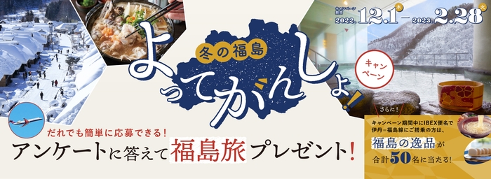 アイベックスエアラインズ株式会社(本社:東京都江東区・代表取締役社長:前澤豊、以下 IBEX)は、2022 年 12 月 1 日(木)~2023 年 2 月 28 日(火)の期間におきまして、「冬の福島 よってがんしょ!キャンペーン」を実施いたします。