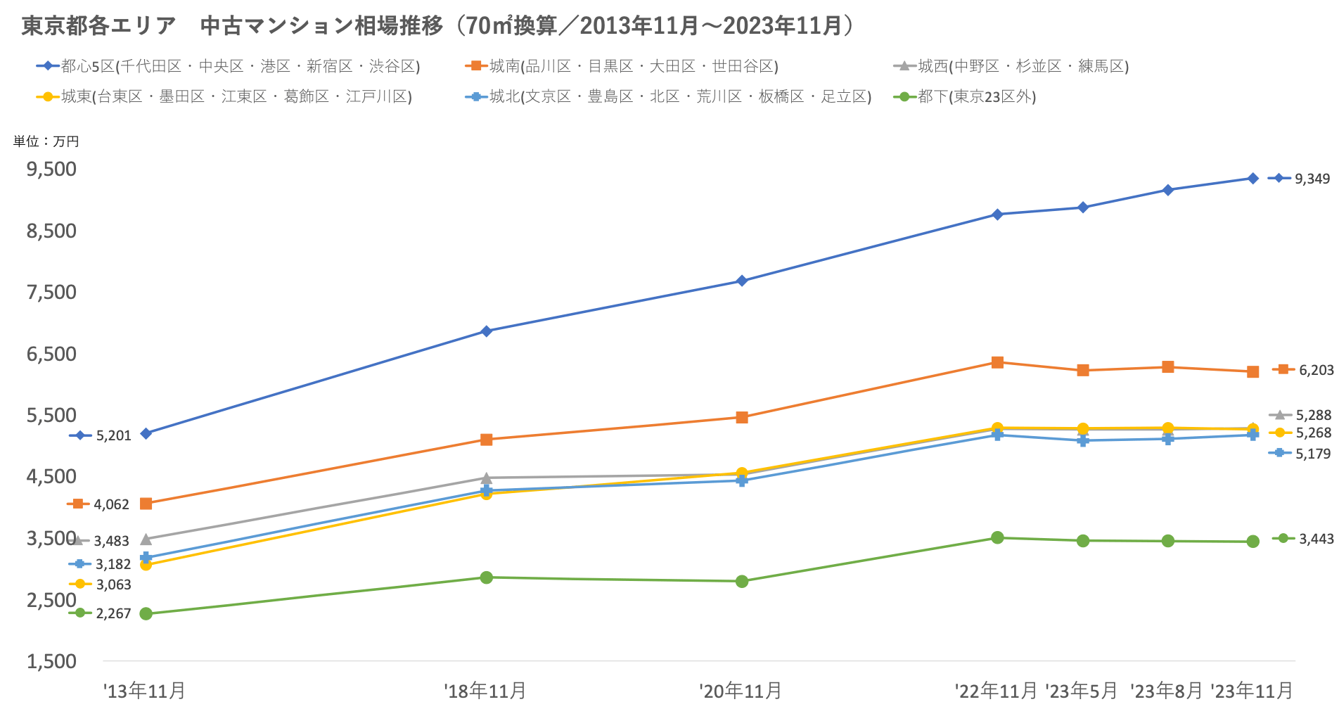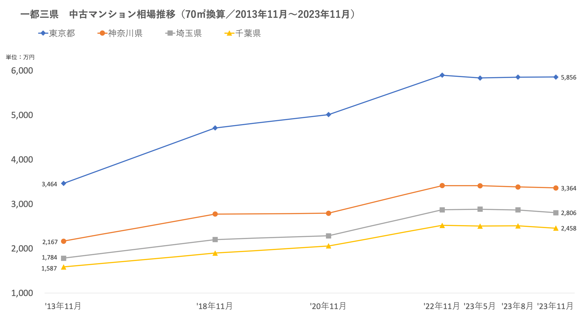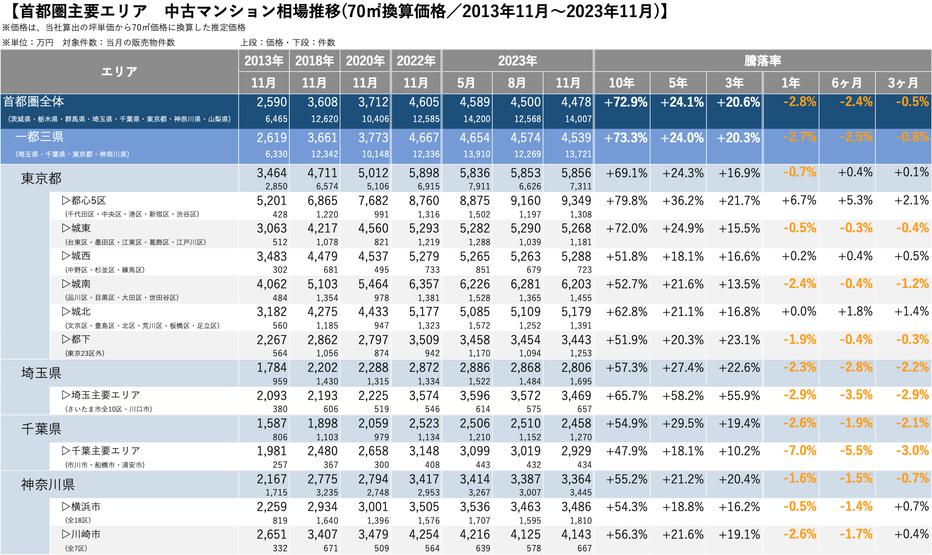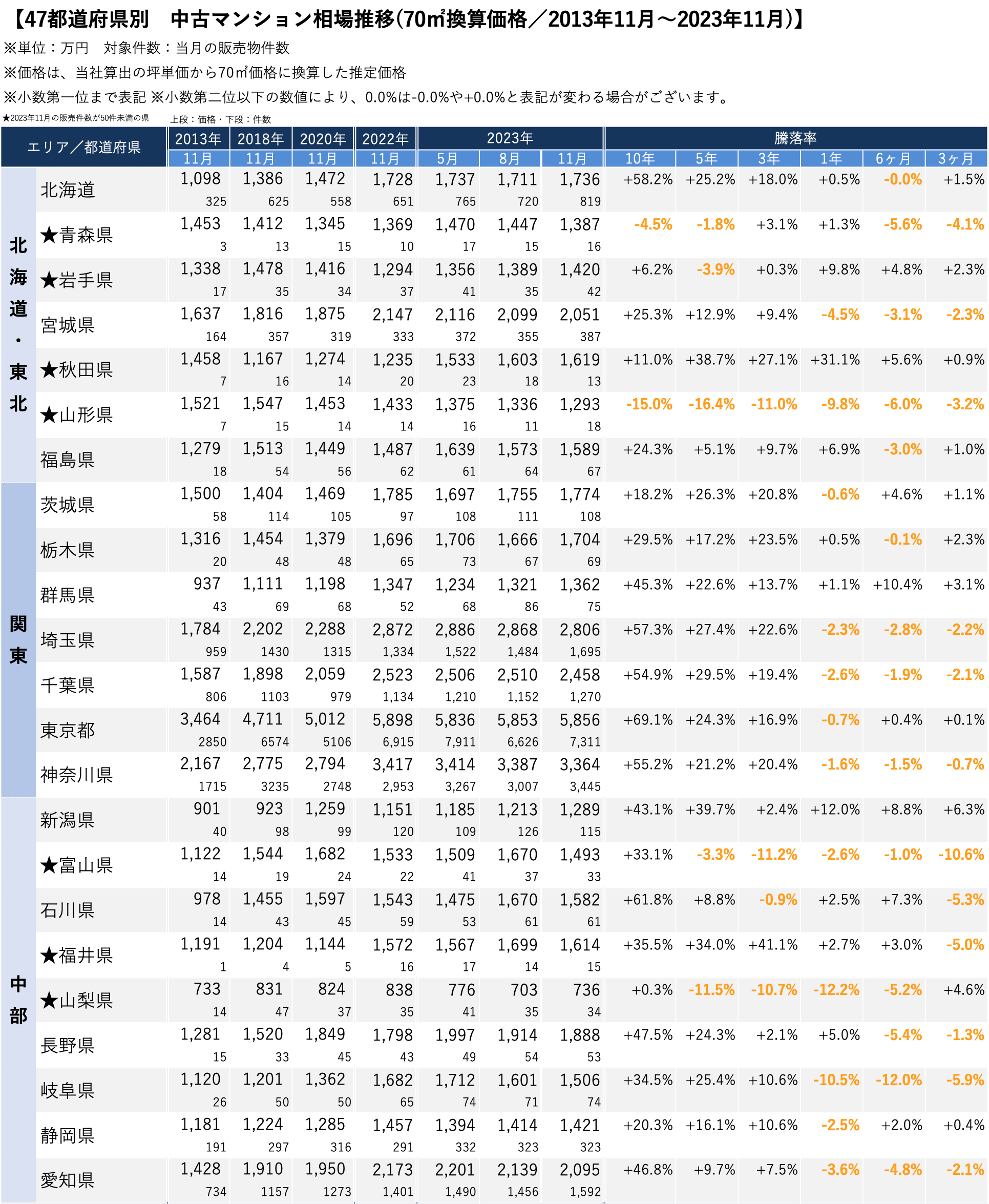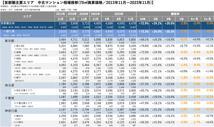 「不動産×WEB×ビッグデータ」の領域で、さまざまな不動産テックサービスを展開する株式会社ワンノブアカインド(本社:東京都港区、代表取締役社長:川島 直也、以下当社)は、当社が運営しているマンション情報サイト「マンションレビュー」の保有データを元に、全国の2023年11月の中古マンション相場を調査。坪単価をベースに70㎡での価格に換算した「中古マンション価格」*1について、10年前・5年前・3年前・前年からの推移を都道府県別・エリアごとにまとめましたので、発表いたします。