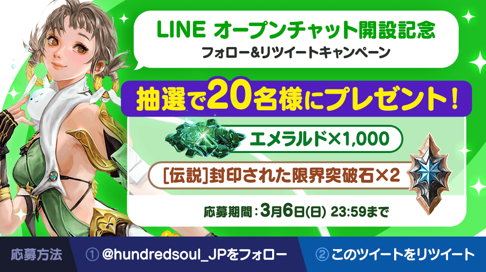 公式Twitterアカウントをフォロー&対象ツイートをリツイートした人の中から抽選で20名様に、「エメラルド×1,000」と「[伝説]封印された限界突破石×2」 をプレゼントします。