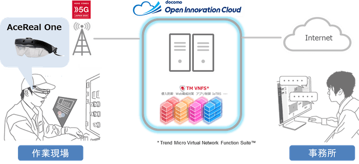 サン電子様が提供するクラウド型業務支援アプリケーション「AceReal Apps」とトレンドマイクロが提供する「Trend Micro Virtual Network Function Suite」がドコモオープンイノベーションクラウドで協創することで、「AceReal Apps」やARスマートグラス「AceReal One」に対する外部からの不正な操作や脆弱性を突いた攻撃を防ぐことができます。