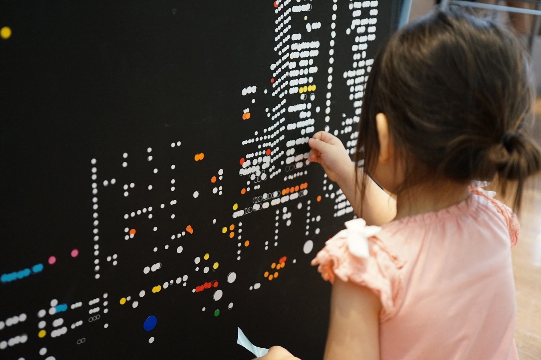 好きな色と大きさのシールを選んで、下書きされた箇所に貼っていくと、次第に大きな花火が完成していく共同制作アートイベントです。