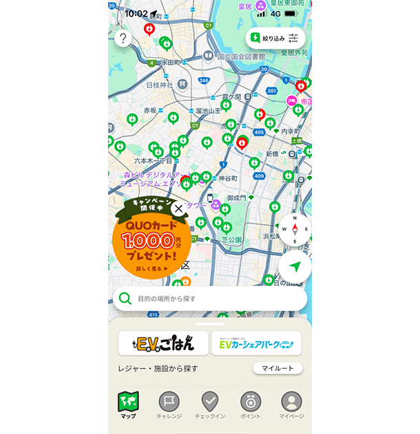 そのため、移動距離によって自動的に貯まるポイントや口コミ投稿ポイントなど【おでかけEV】ならではの機能は、ガソリン車に乗りながらも使用可能。多くの人にEV充電スポットの設置場所や検索など楽しみながら知ってもらい、アンケートや口コミにより実情把握と更なるユーザビリティ向上を目指します。
