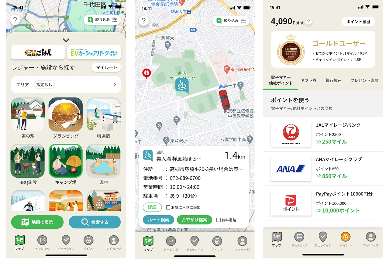 さらに「移動距離」「口コミ投稿」「チェックイン」「キャンペーン」等で【ポイント】が貯められ、電子マネーやギフト券等に交換できる機能など、使えば使うほど楽しさが満載のアプリ。年内には、条件設定するとおでかけ途中の充電スポット候補を出してくれる待望の【おでかけ提案】機能も開始予定。益々機能を追加しつつ日々進化しています。