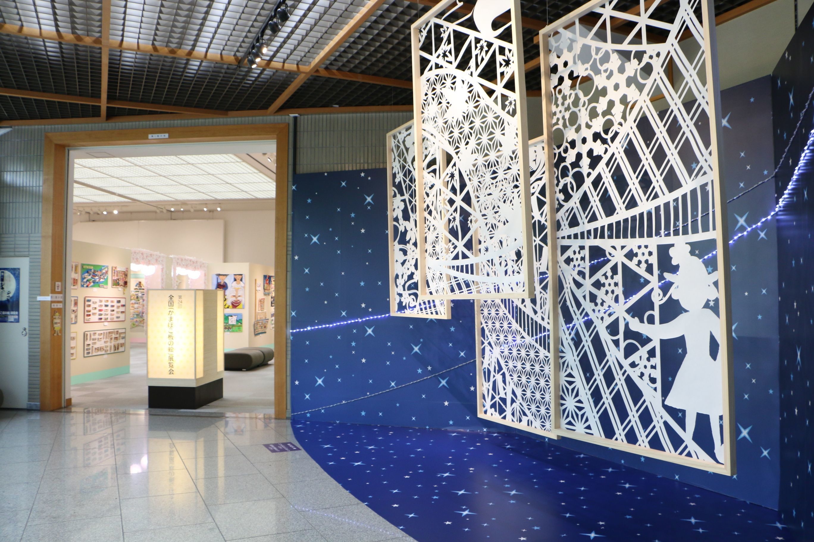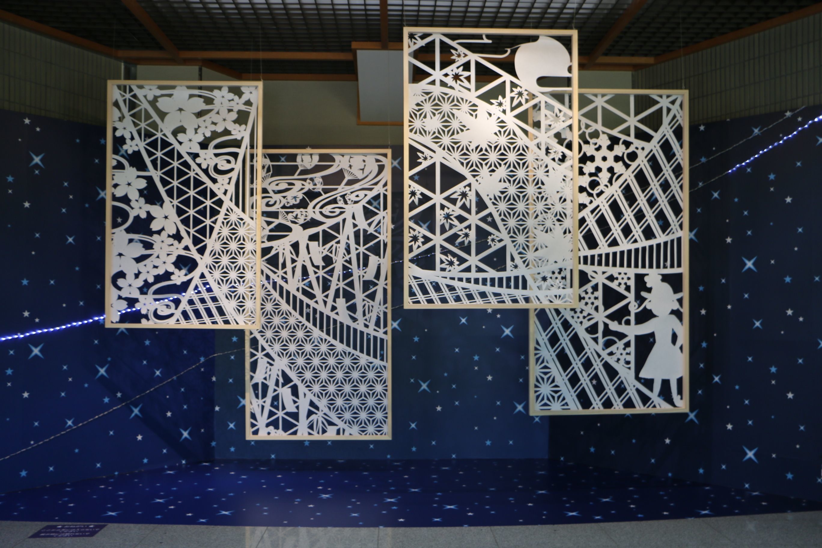 ・エントランスVPは満点の夜空をバックに、日本の四季を表現した切り絵を設置した、これまでに無いデザインになりました。(ふるさとや懐かしさを感じてほしい。)