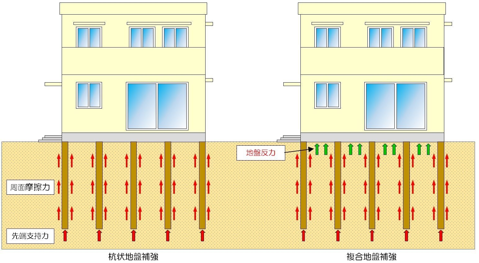 杭状地盤補強の支持力(周面摩擦力+先端支持力)に杭間地盤反力を適切に加えることで合理的な設計を実現しています。