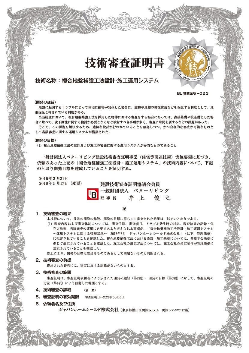 住宅地盤調査・地盤補強工事を数多く手がけるジャパンホームシールド株式会社が開発した画期的な運用システムである複合地盤補強工法設計・施工運用システムの適用工法に『環境パイル工法』がラインナップされることで第三者機関による定期的な運用審査がなされるため、客観的にも品質を確保することで顧客に対する信頼性を高めることを目的としています。