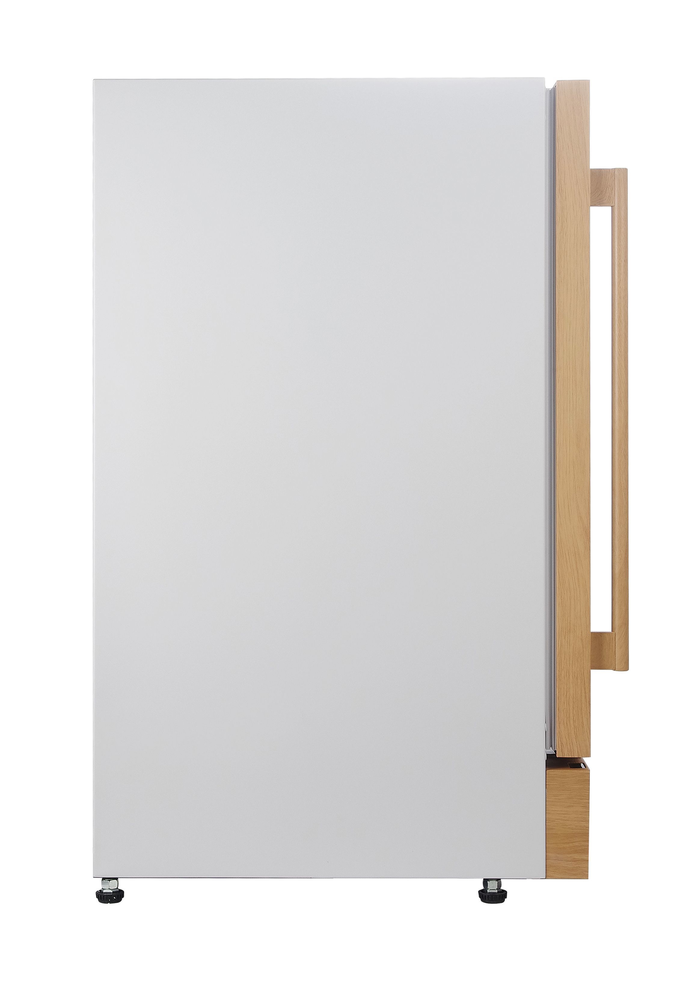 ワインセラーには珍しいホワイトボディーを採用し、ハンドルやドアなどに木目をあしらうなど明るいキッチンや和室などにもフィットするインテリア性を重視した外観仕様となっています。