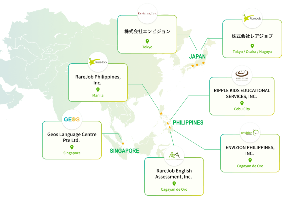 レアジョブでは、グループビジョン“Chances for everyone, everywhere.”に基づき「グローバルに人々が活躍する基盤を作る」ことを目指しています。サービスミッションには「日本人1,000万人を英語が話せるようにする。」を掲げ、マンツーマンのオンライン英会話サービス「レアジョブ英会話」を中心に事業を展開しています。ビジョン・ミッションの実現に向け、EdTech企業のリーディングカンパニーとして、国内のみならず事業のグローバル展開を推進してまいります。