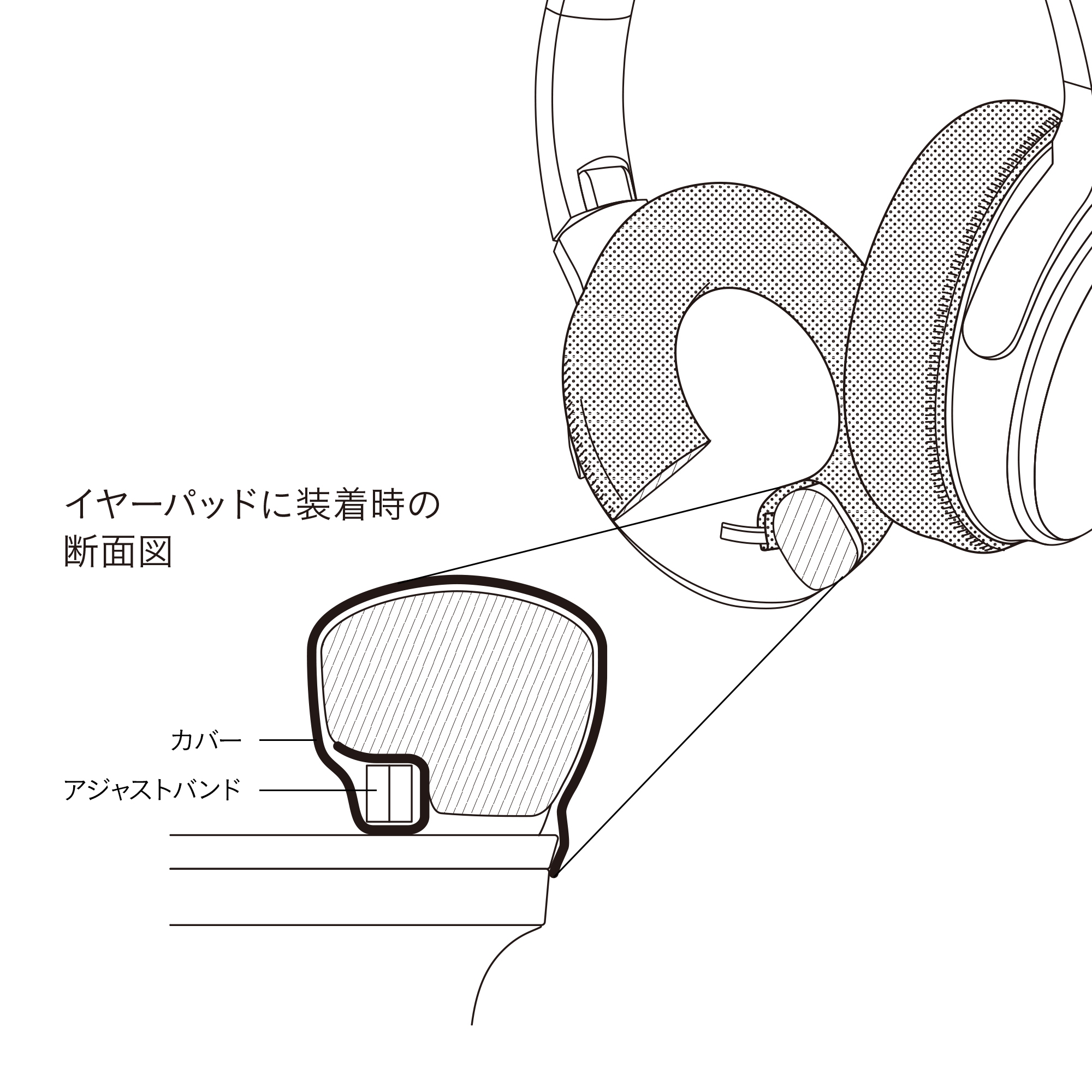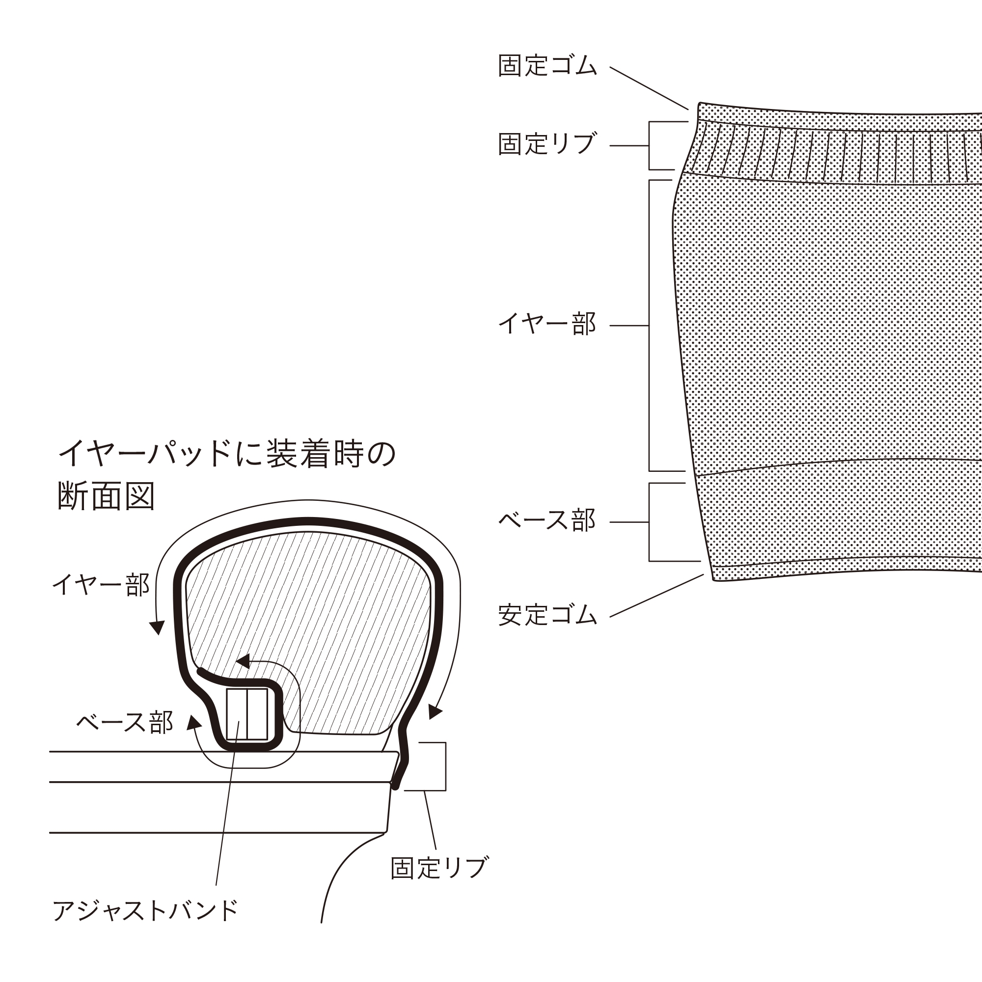 まず、カバーの製造方法を従来のカットソーから専用に編み上げる一体成型とし、縫い目がなく、伸縮性に優れた円筒状のカバーを実現。イヤーパッドの内側にもピッタリフィットさせるため、独自構造のアジャストバンドを開発しました。さらに、カバーとアジャストバンドを分離する構造により、カバーの長さを自由に調整できるようにし、イヤーパッド付近にあるボタンや充電端子には干渉せずに、イヤーパッド部分だけカバーするなどの微妙な調整を可能としました。