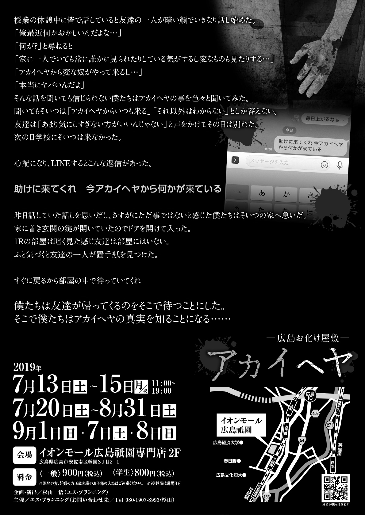 イベント企画 エス・プランニング(所在地:広島県広島市、代表:杉山 悟)は、2019年7月13日(土)~9月8日(日)の期間中、「広島お化け屋敷アカイヘヤ」をイオンモール広島祇園で開催いたします。