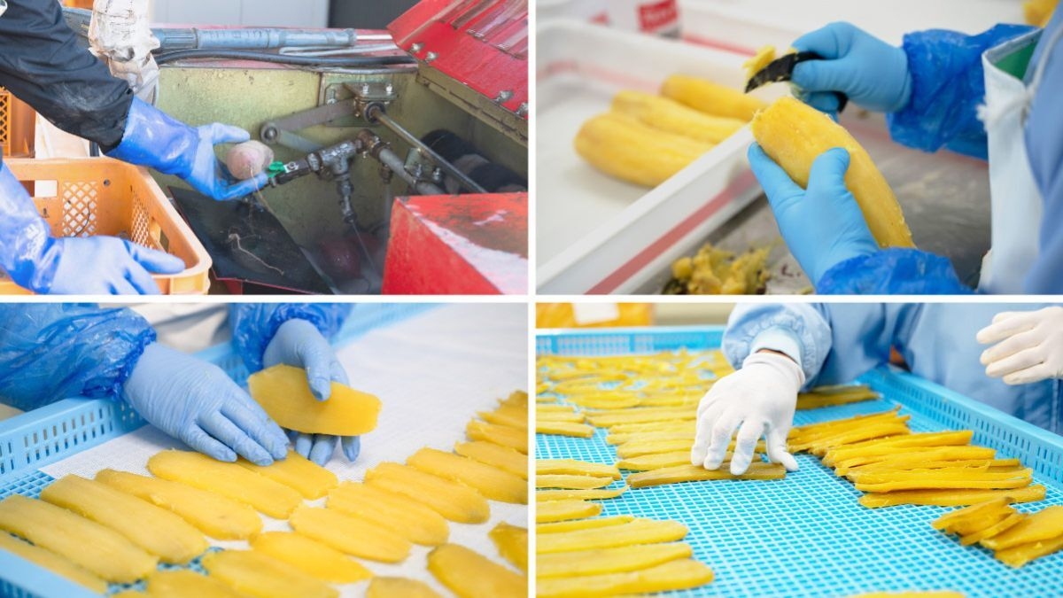 「ほしいぼー」はしっとりとした食感と濃厚な甘みが特徴の茨城県産「紅はるか」を100%使用。「蒸す」「切る」「乾燥」というとてもシンプルな工程で作られるからこそ、素材の質の高さはもちろん、熟練の技が沢山詰まっています。選別から加工までの工程を丁寧な手作業で大切に作っているのもこだわりの一つです。