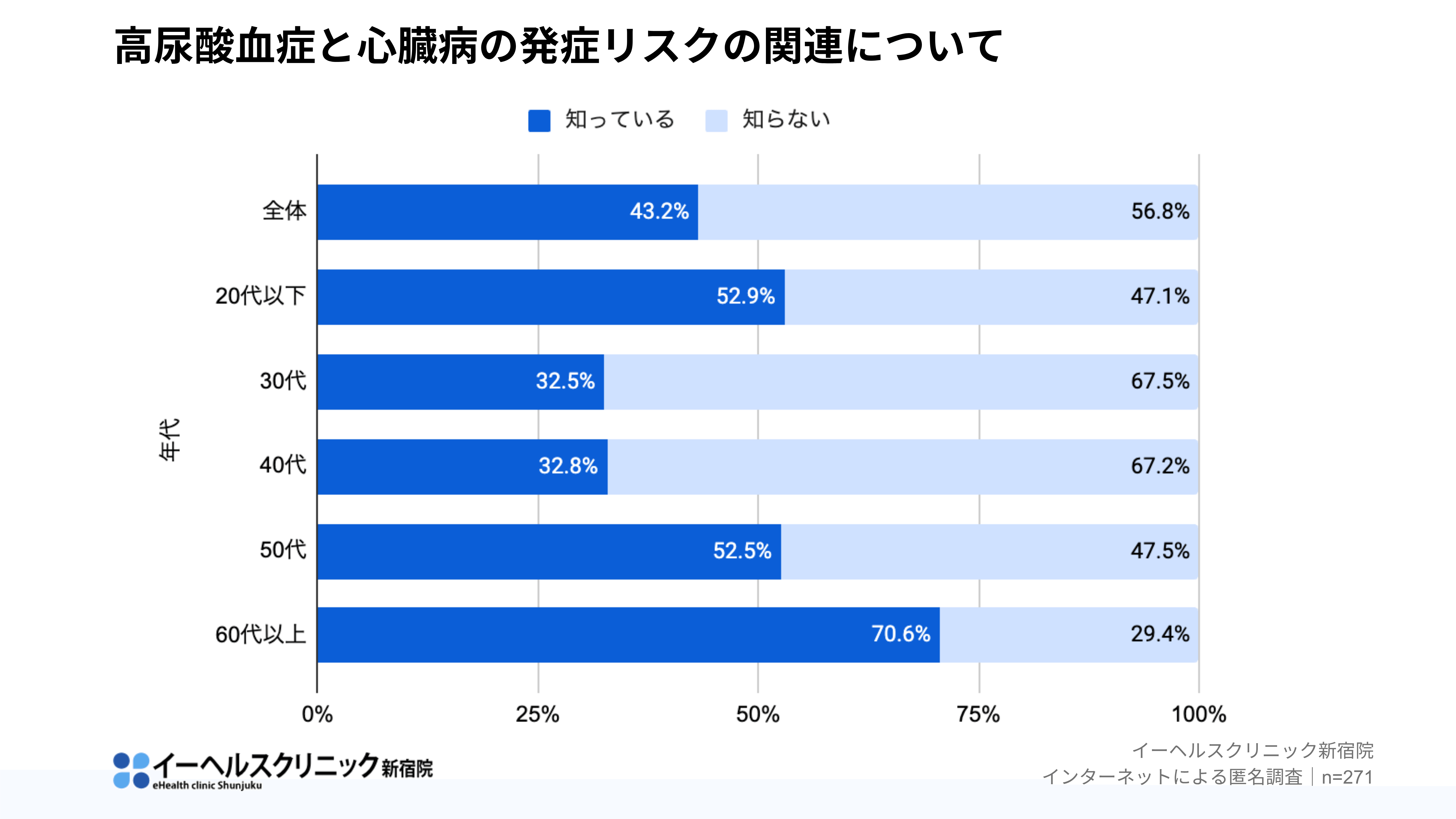 尿酸値が高い状態(高尿酸血症)が続くと、「心臓病(心筋梗塞や狭心症など)」の発症リスクが高まる可能性があることを知っている人は、全体の43.2%にとどまりました。特に30〜40代の働き盛りの世代では、認知度が32%程度にとどまり、十分に理解が進んでいない実態が明らかになりました。